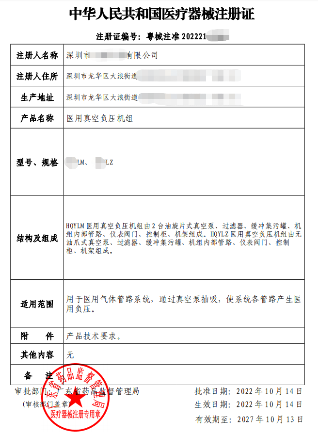醫(yī)用真空負(fù)壓機(jī)組注冊證